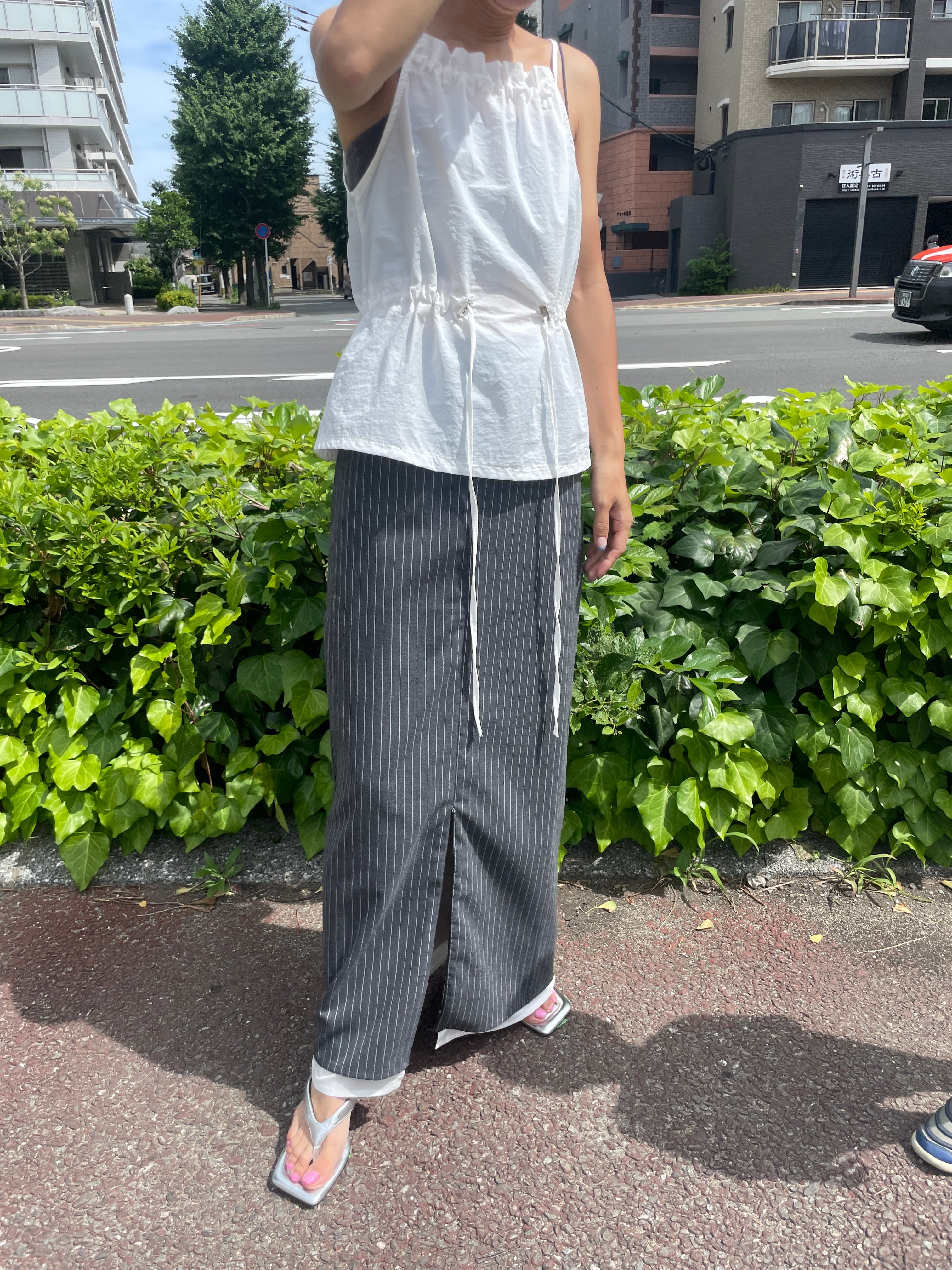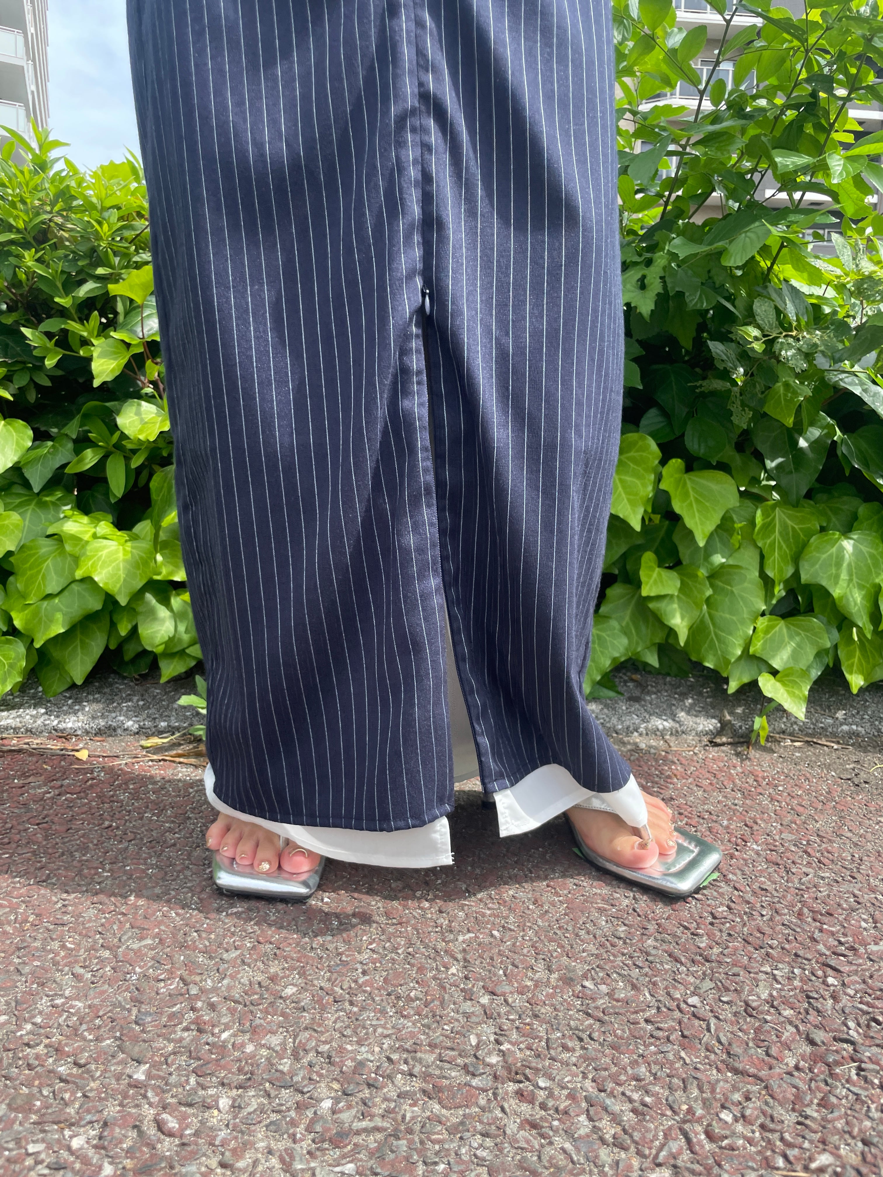 フロントジップがこなれ感を出してくれストレスフリーに着用いただけます・トレンドのストライプはトップスに合わせてカジュアルにもキレイめにも◎