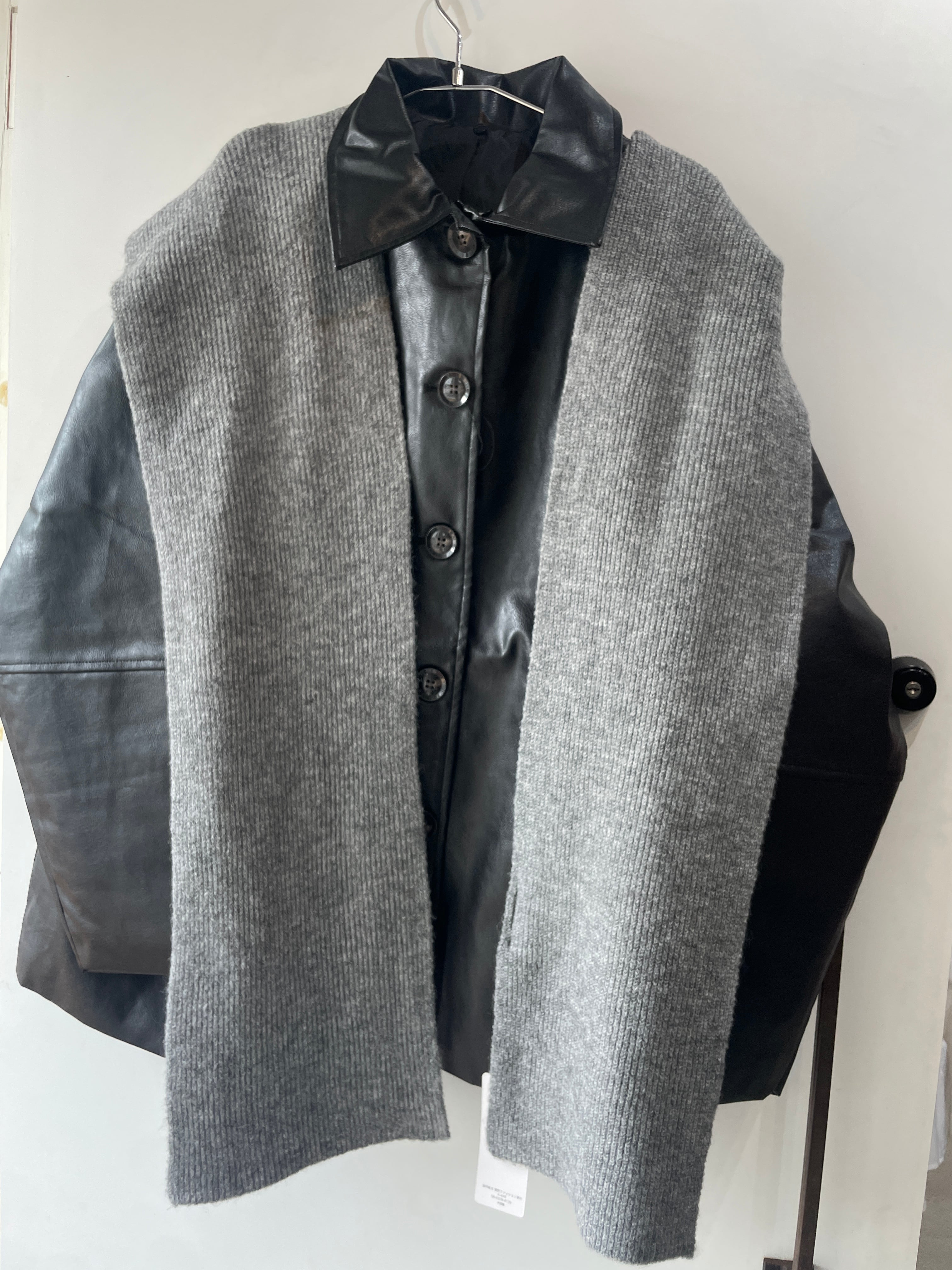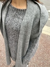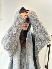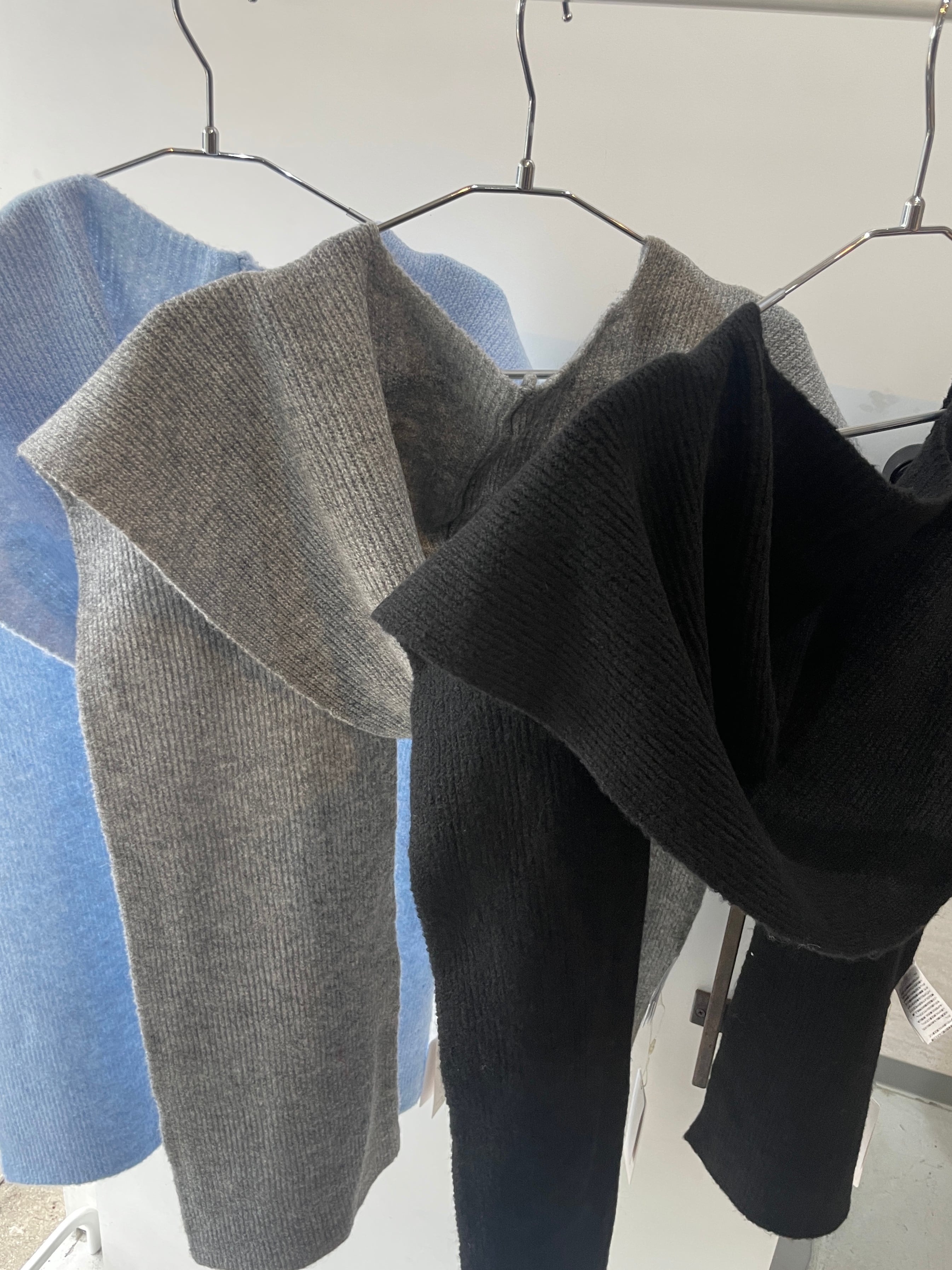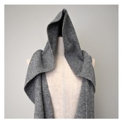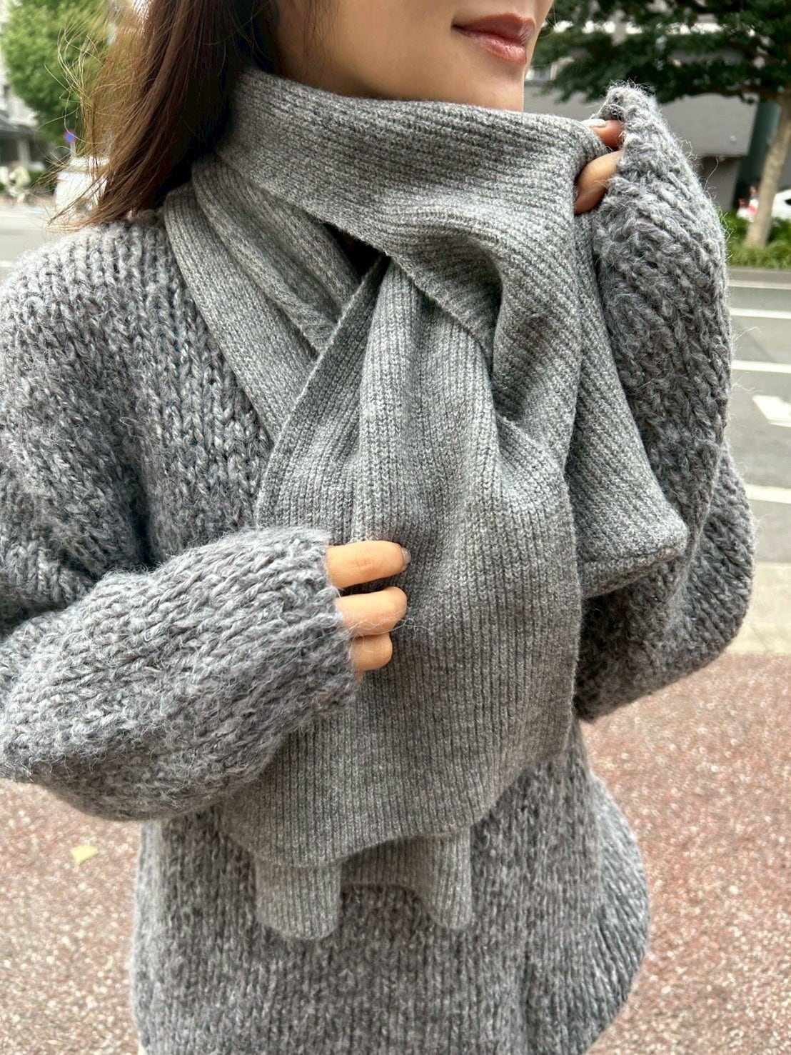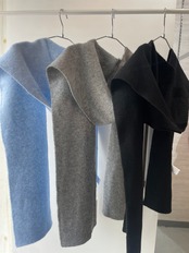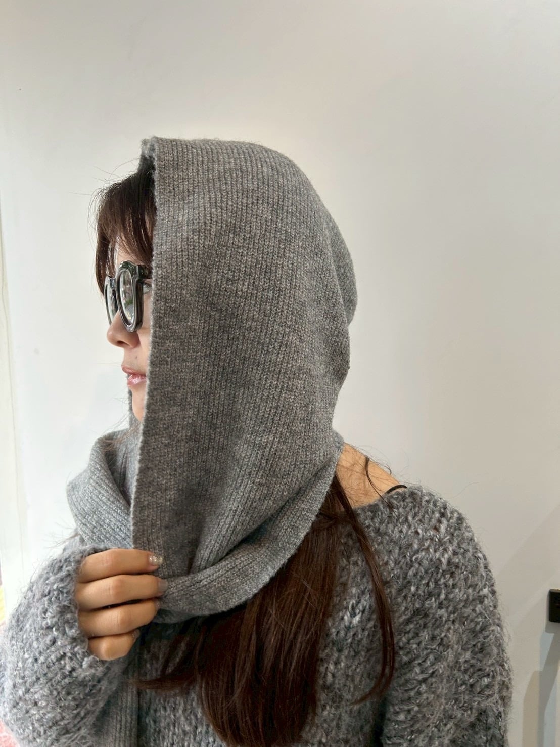 フード付きマフラーがシンプルなトップスと合わせるだけで主役級の存在感を発揮します