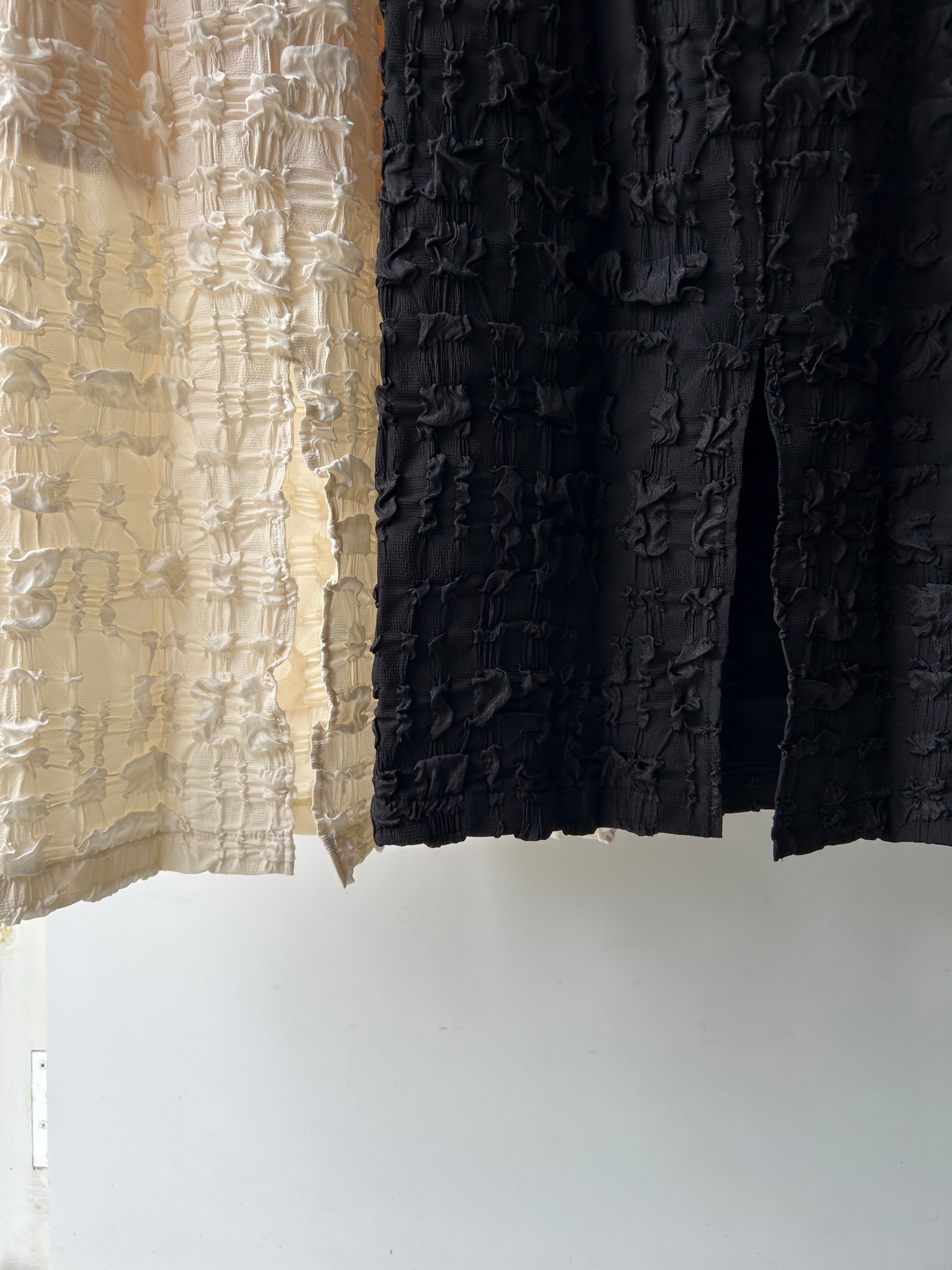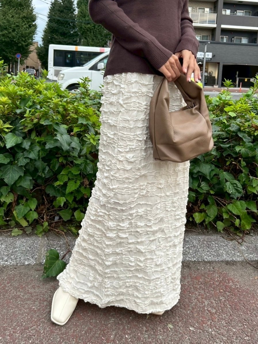 ポコポコ感を出すことでシンプルすぎず、タイトスカートにすることでガーリー過ぎずなカジュアルにもフェミニンにもなるデザインスカート
