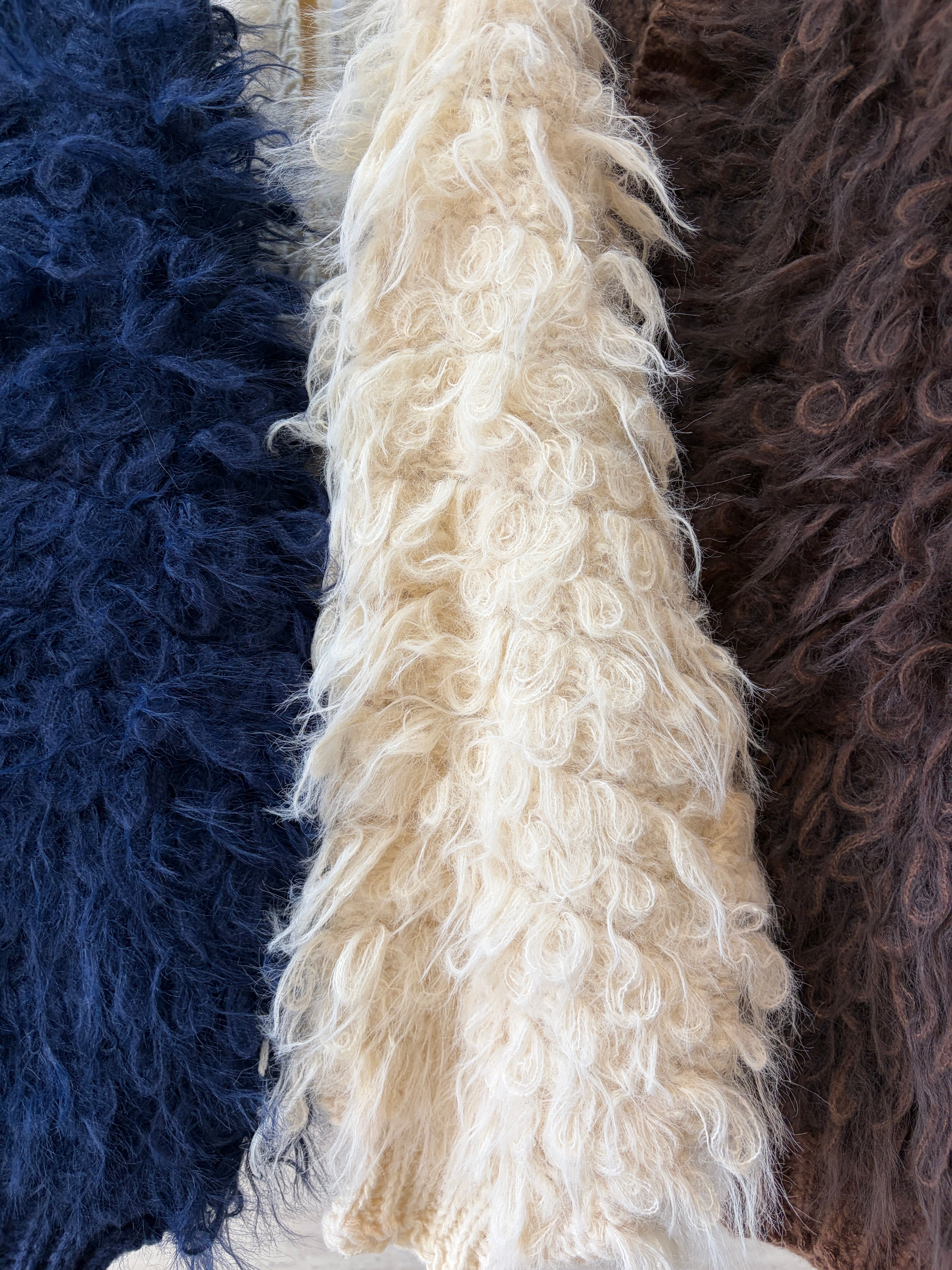 ・毛足のある素材感がシーズンムードをぐっと高め、羽織るだけでスタイリングが華やかに
