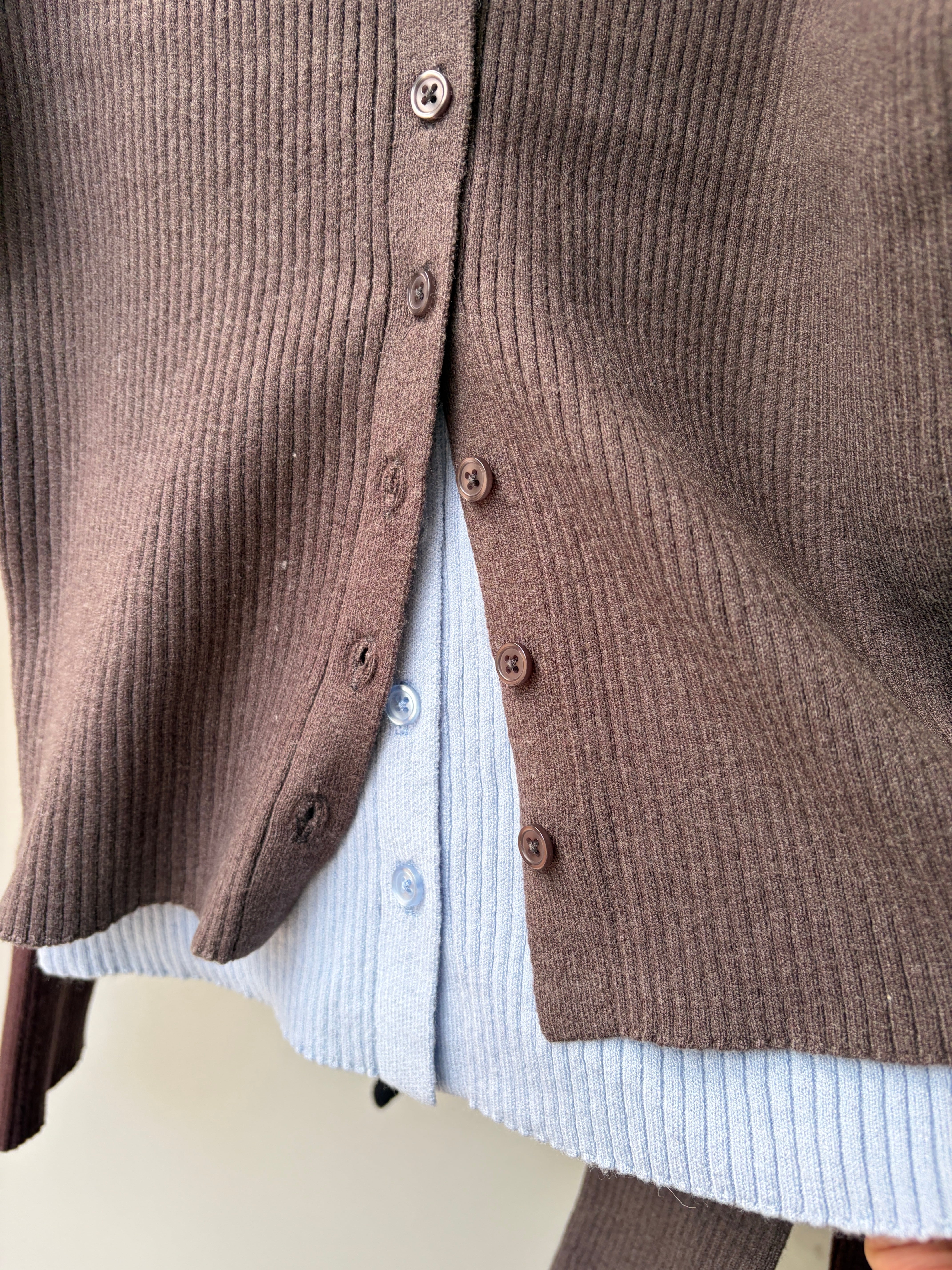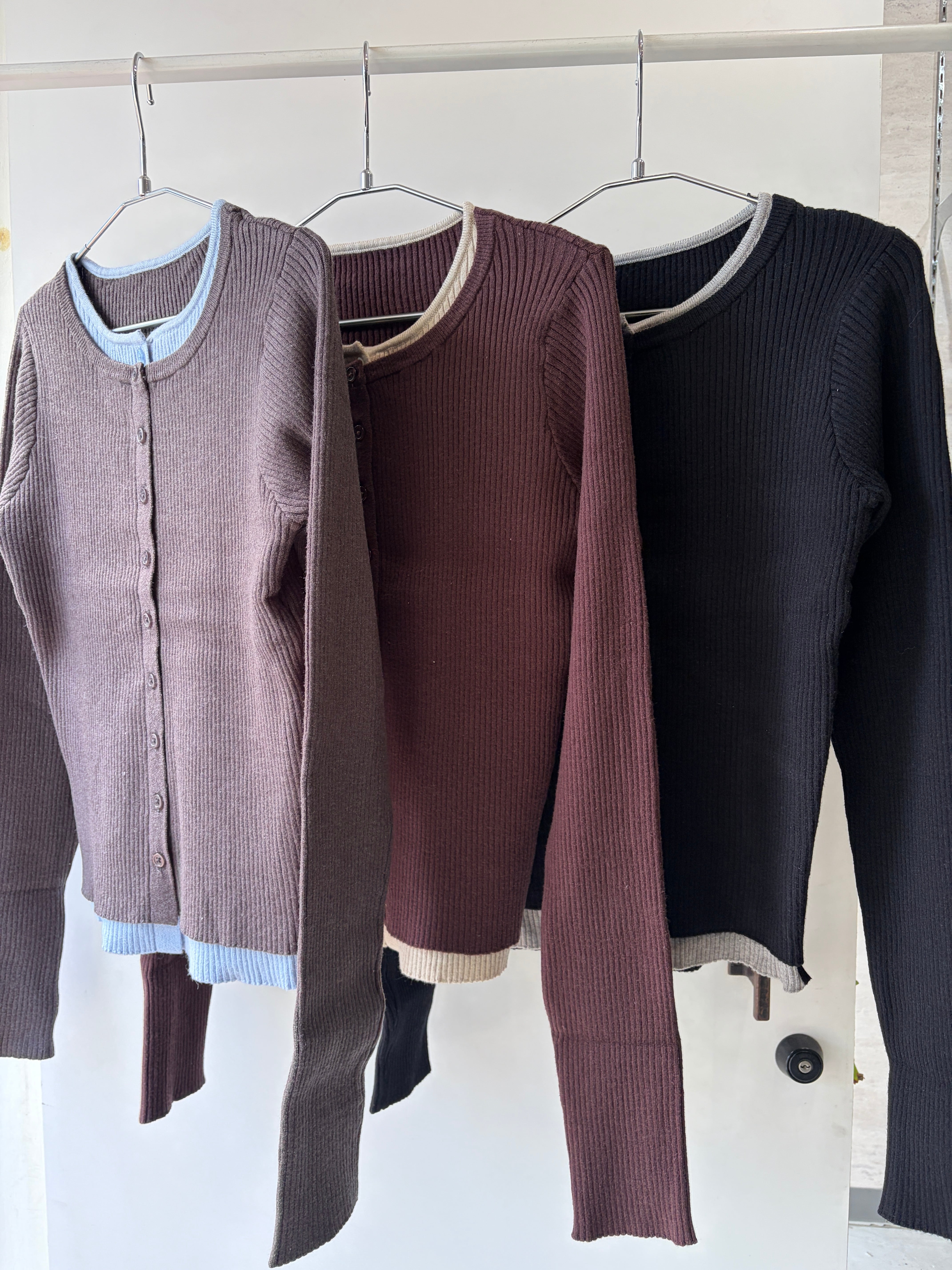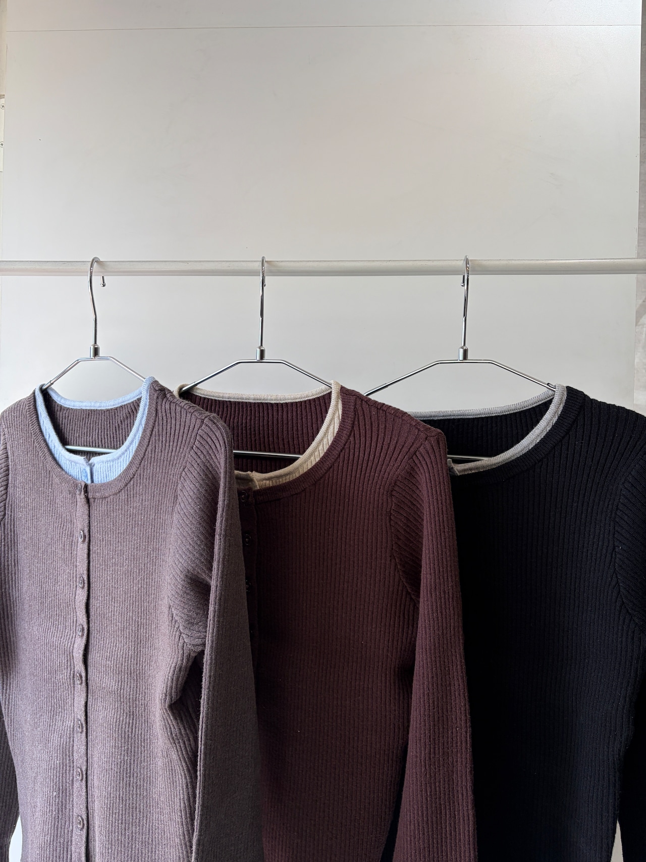 レイヤード見えする配色デザインが魅力のクルーネックカーディガン