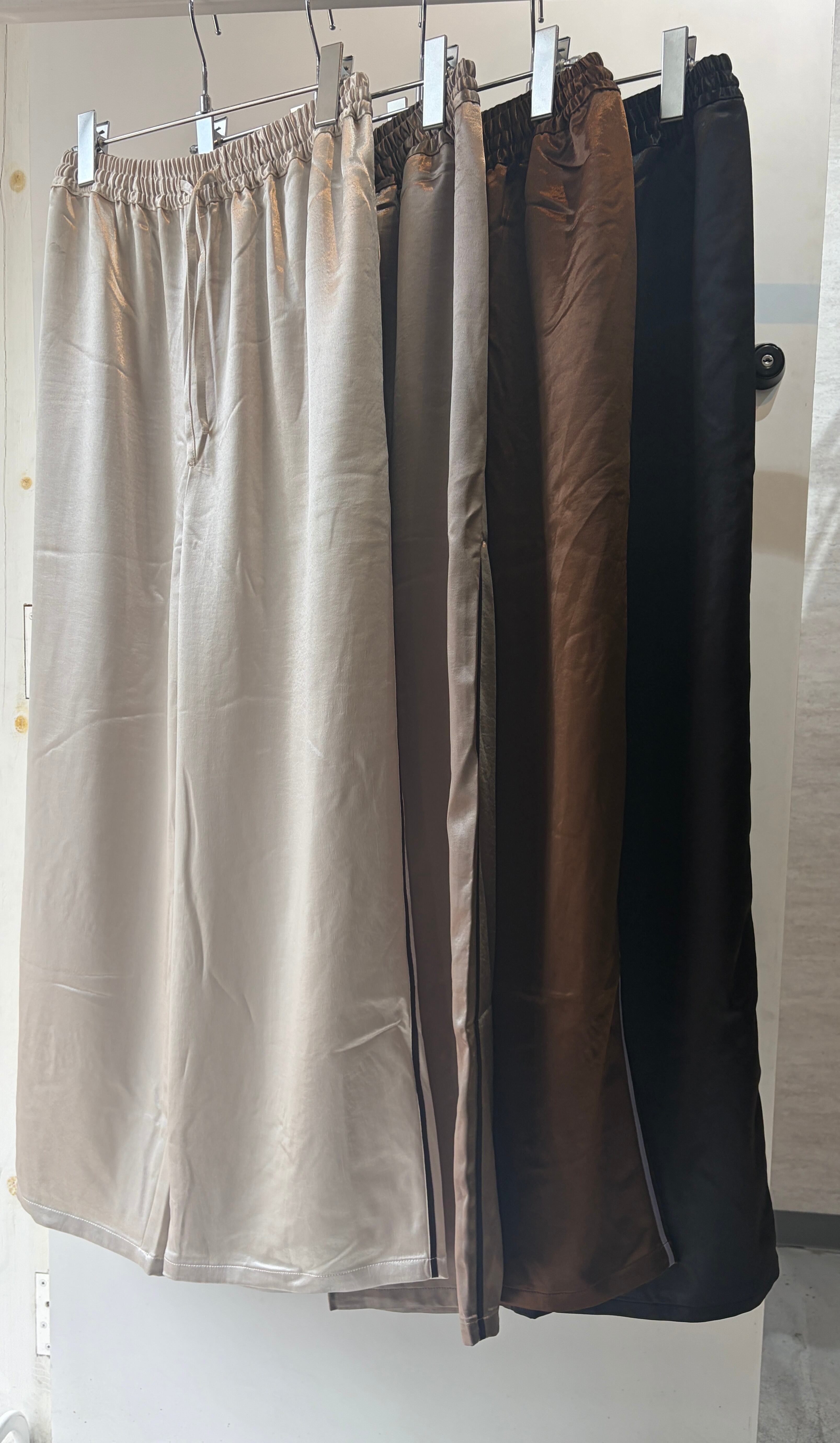 とろみのある落ち感と光沢が魅力のサテン素材を使用したパンツ