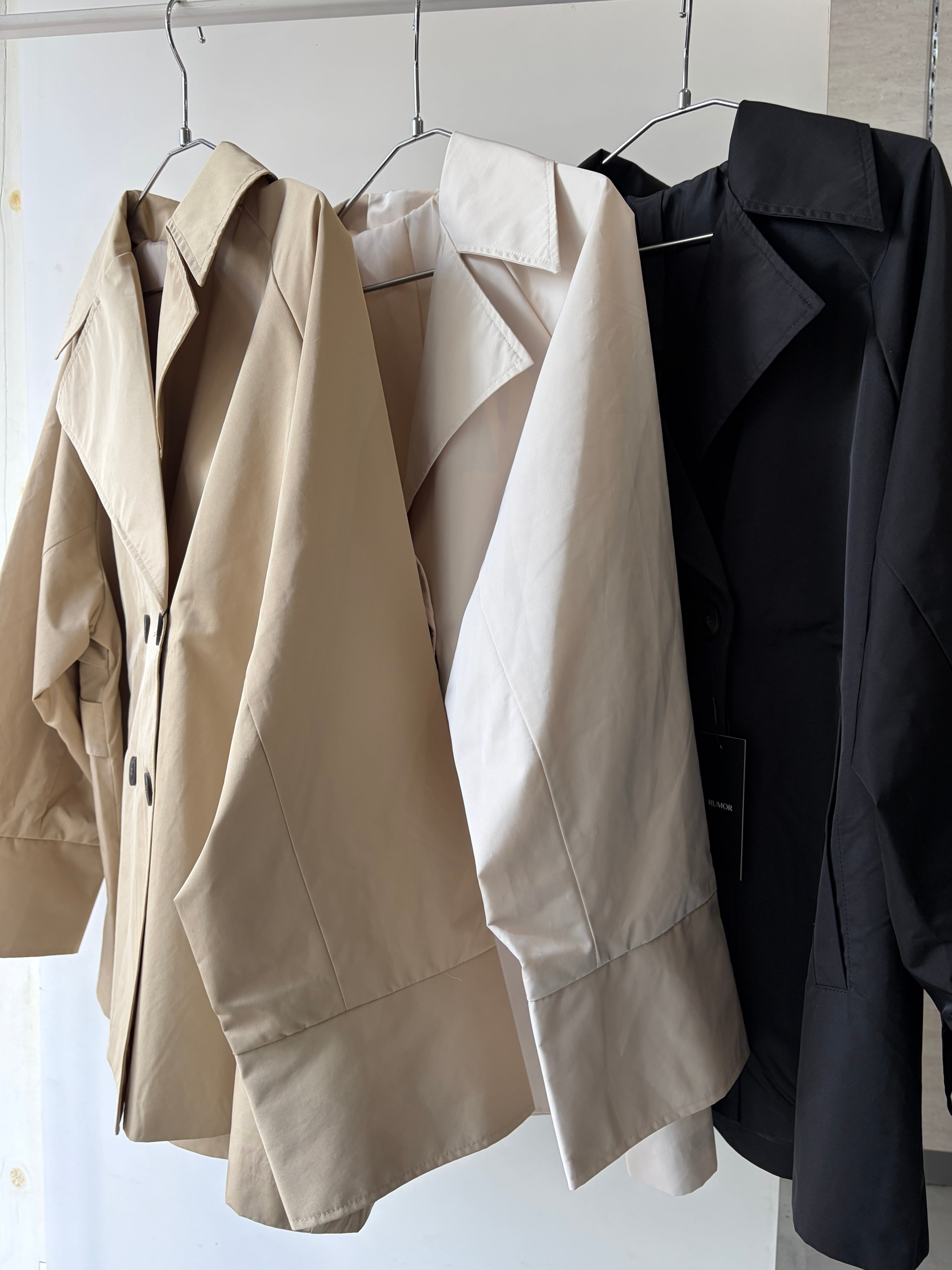トレンチらしいディテールを残しつつ、ナイロンならではの抜け感でデイリーに取り入れやすい一着に