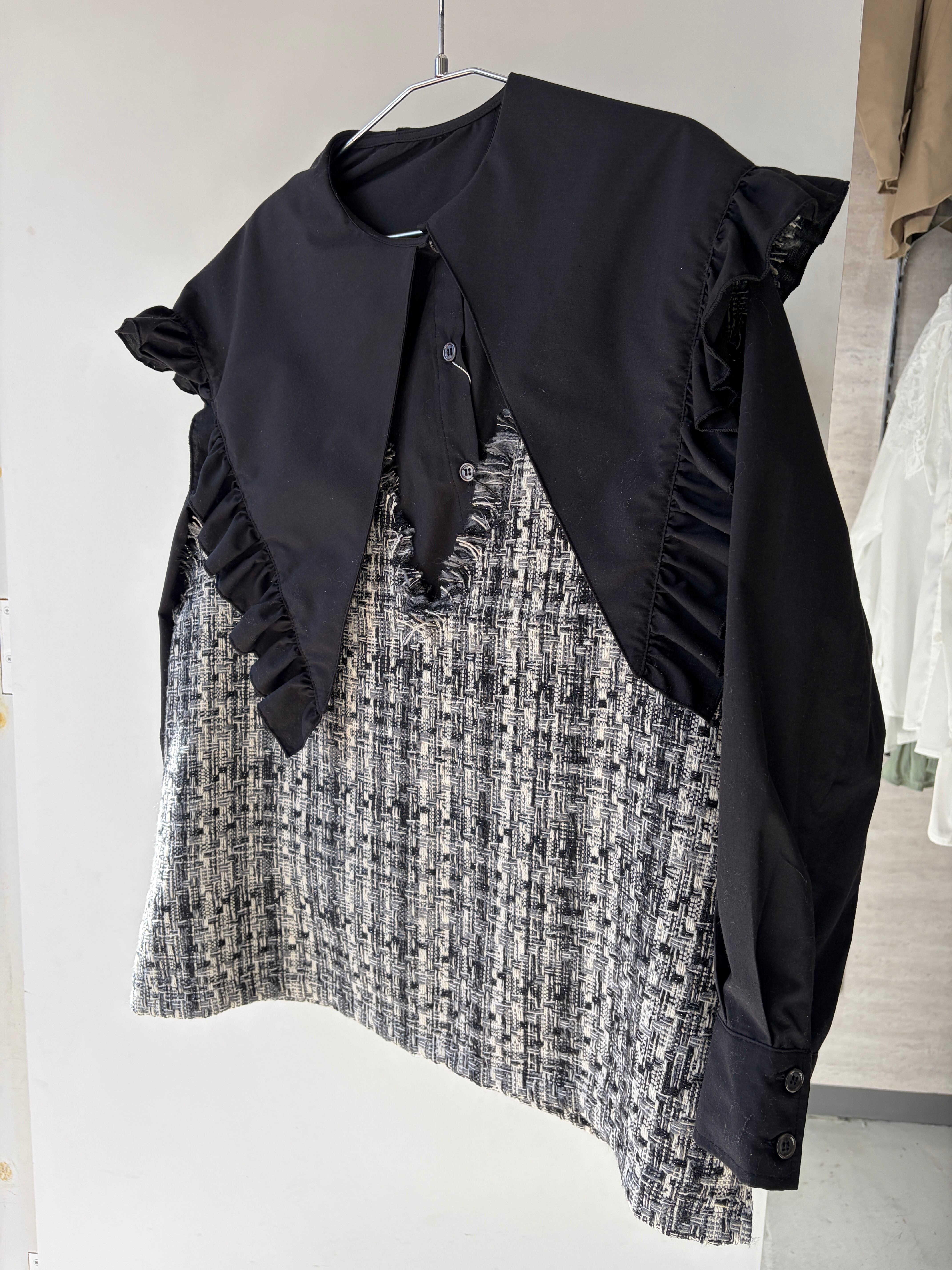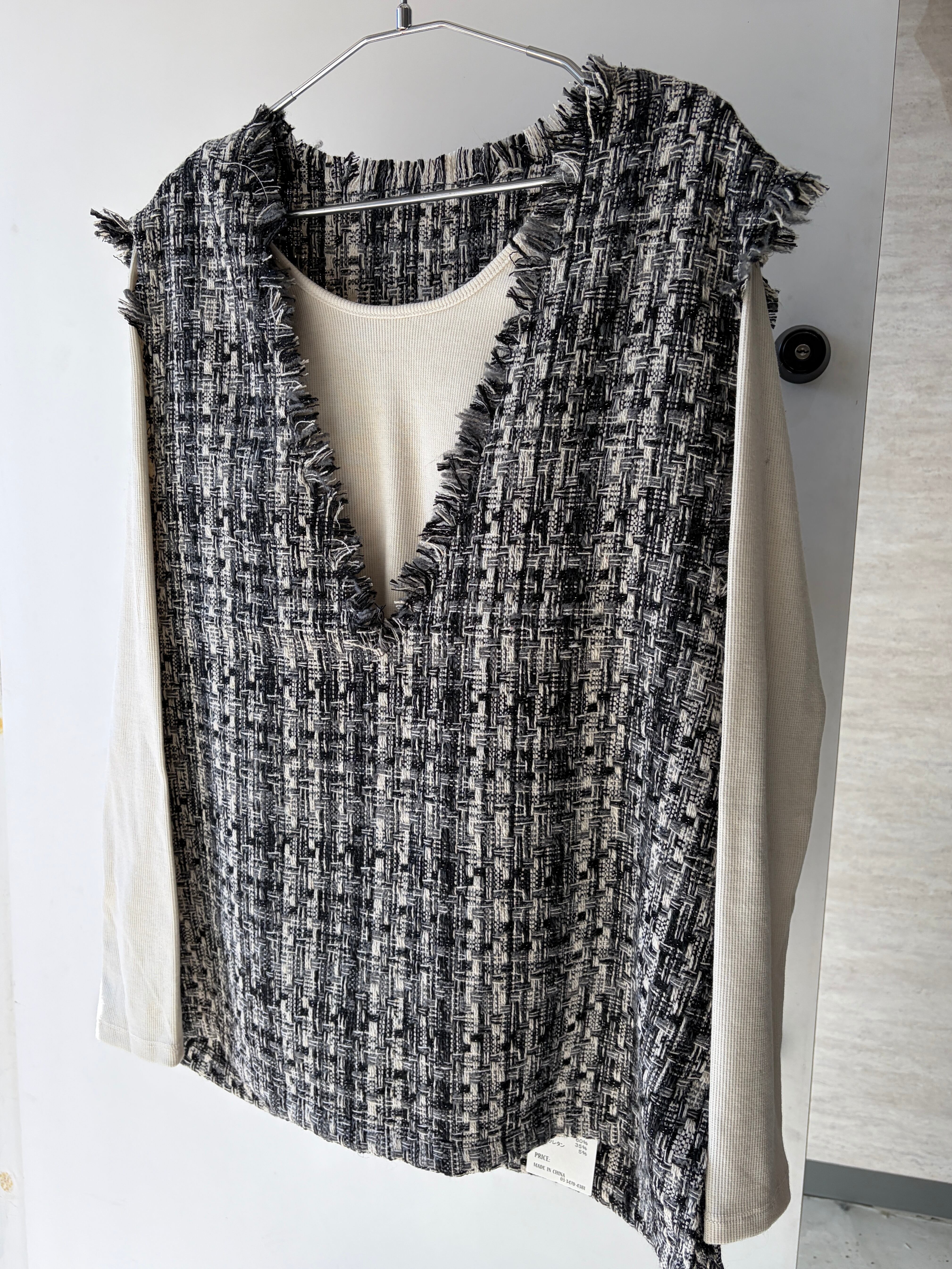 長めのフリンジが存在感抜群。ざっくり深Vツイードベスト