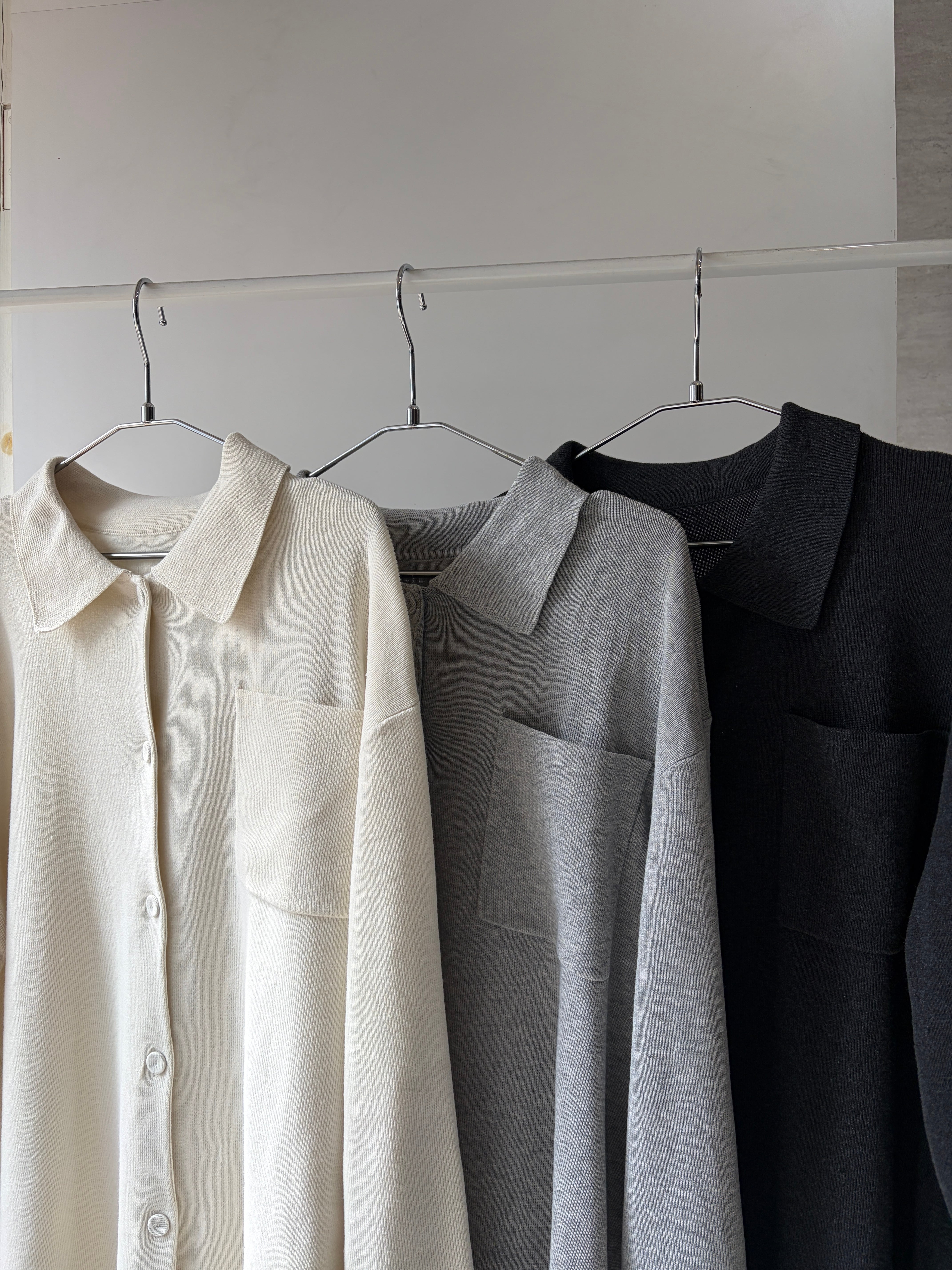 ベーシックアイテムでありながら、シャツ型のおかげできちんと感も出せ、寒い時期はインナーに あたたかくなったら羽織としても大活躍の一品