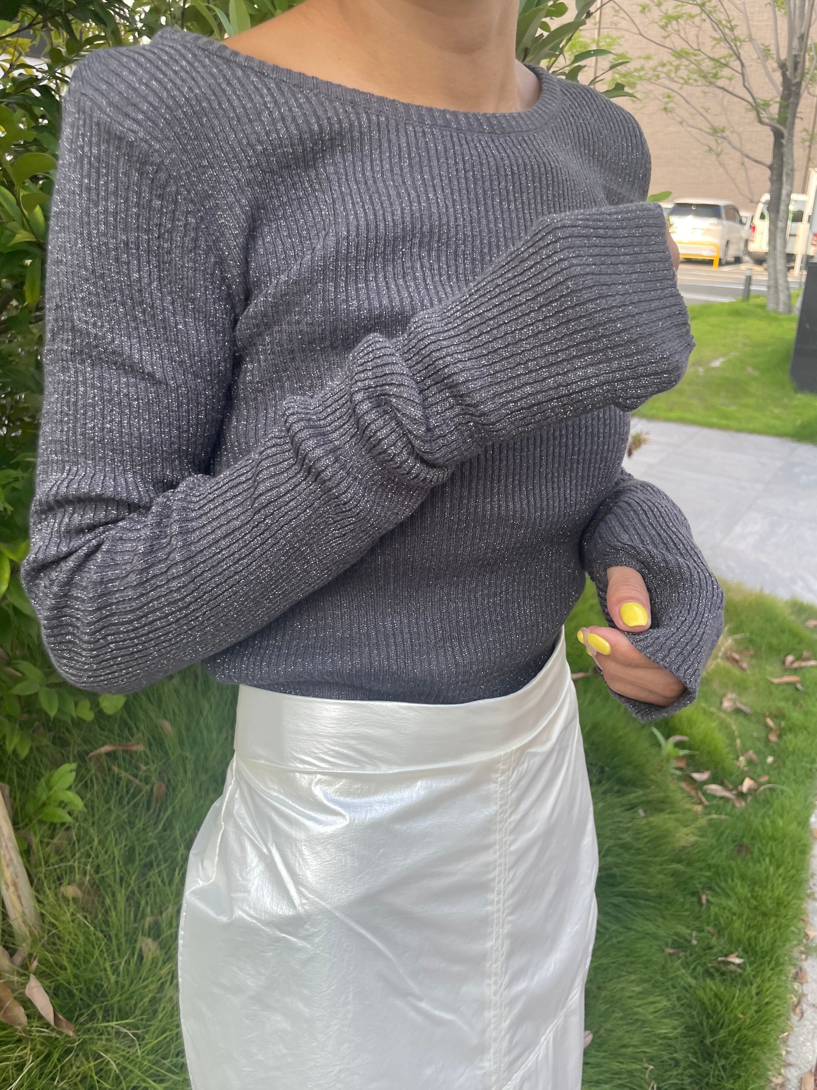 ラメがかわいいクルーネックニットプルオーバー袖は指穴あきになっていてアームウォーマー風の着こなしも可能◎
